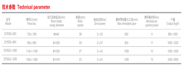 DYSSG系列撕碎機(jī)可用于直徑1200MM的PE,PP,PVC管材撕碎,長度達(dá)3-6M的管材直接破碎,無需分割,其轉(zhuǎn)速緩慢運(yùn)轉(zhuǎn)平穩(wěn),各種管材放入水平的喂料槽中,喂料槽自動關(guān)閉由液壓推進(jìn)將管材推向軸中心進(jìn)行破碎。撕碎機(jī)破碎后的材料通過輸送機(jī)帶入二次破碎完成需要的破碎顆粒直徑。