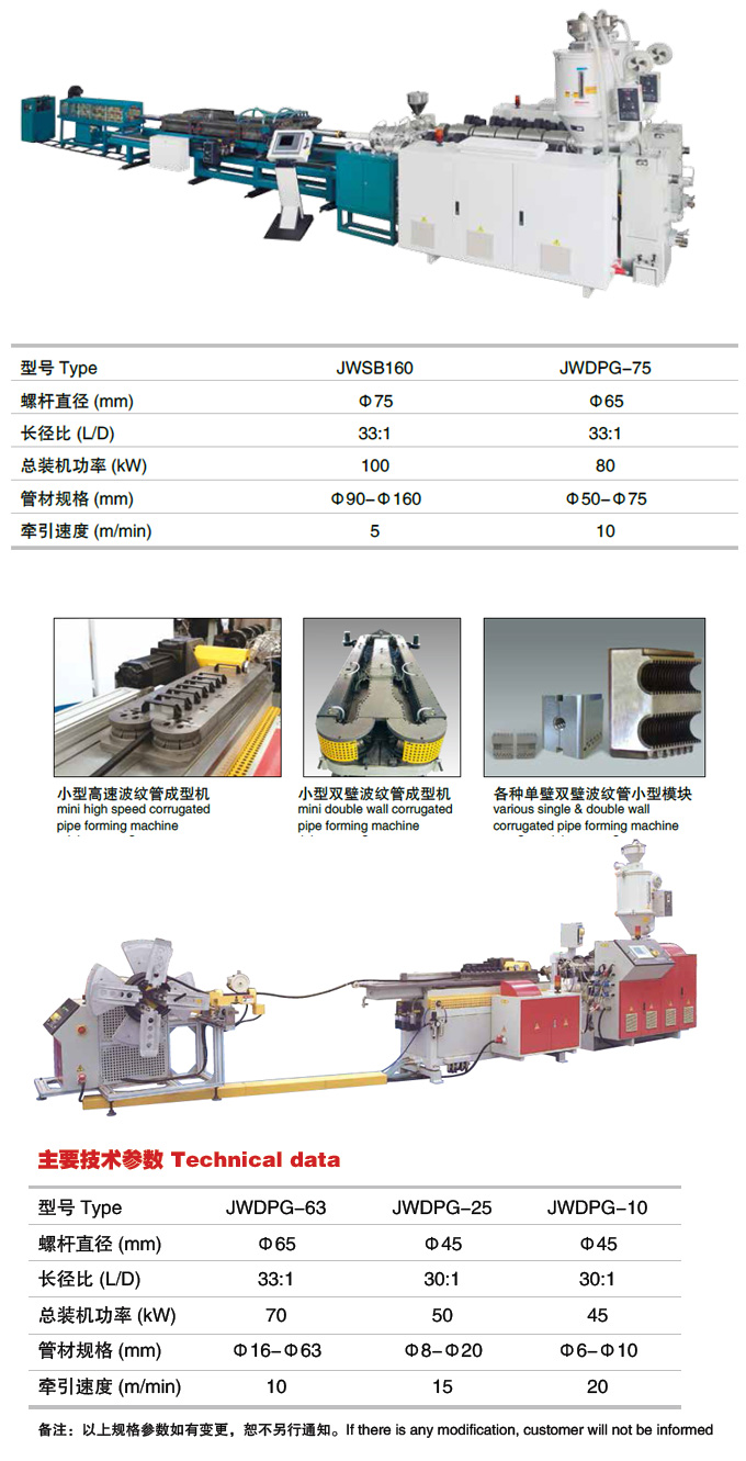 單壁、雙壁波紋管生產(chǎn)線 性能和優(yōu)點: 該設備生產(chǎn)出的管材,耐高溫,耐腐蝕,耐磨損,強度高。用于電氣穿線管、汽車 穿線管、護套管、機床產(chǎn)品、包裝食品機械、電力機車、工程安裝、燈具、自動化儀器儀表等領 域,市場需求大。金緯公司特殊螺桿、模具的結構設計合理,更換模具方便可靠,解決了螺桿機 筒易磨損及物料成形難的問題,生產(chǎn)線速度快,運行穩(wěn)定,控制簡捷易操作。